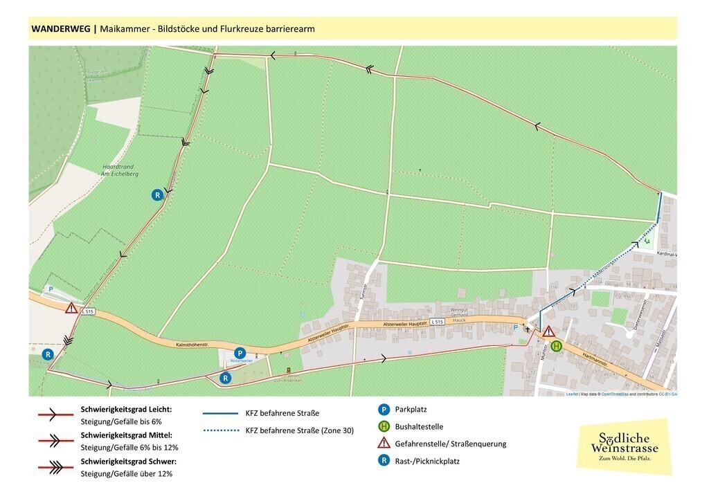 Circuit adapté avec un dénivelé très faible se déroule entièrement sur des chemins pavés vous offrant une vue sur les paysages allentours, il permet de découvrir des sites d'interprétation (notamment sur la route des vins) et croix des champs de Maikammer.