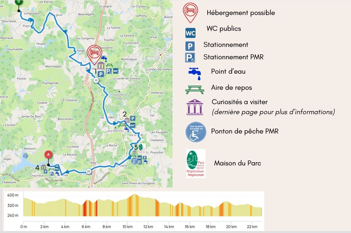 Jour 3 : Après cette pause, vous reprendrez la route en direction du Lac de Miallet ! Il vous reste 13 km, 185m dénivelé positif, 233 m dénivelé négatif ! En chemin vous croiserez le château de Frugie, la Maison du Parc avec son étang et vous finirez au lac de Miallet. Sur place, avant de reprendre le TER, vous avez la possibilité de vous loger : Hôtel-Restaurant Les Voyageurs (1 chambre PMR).